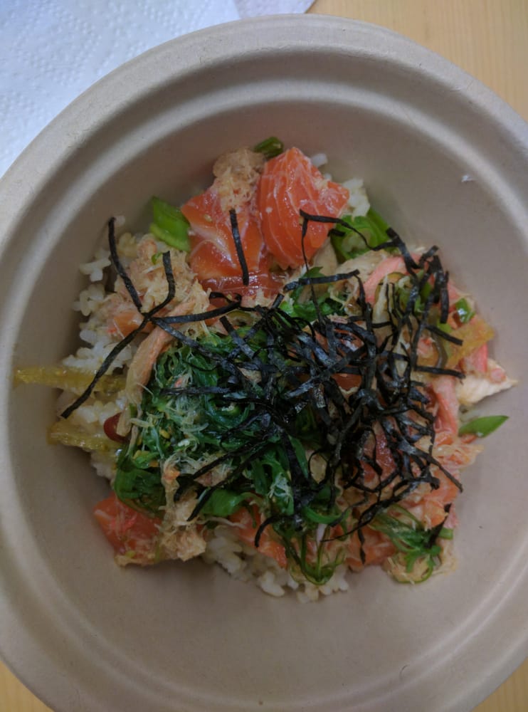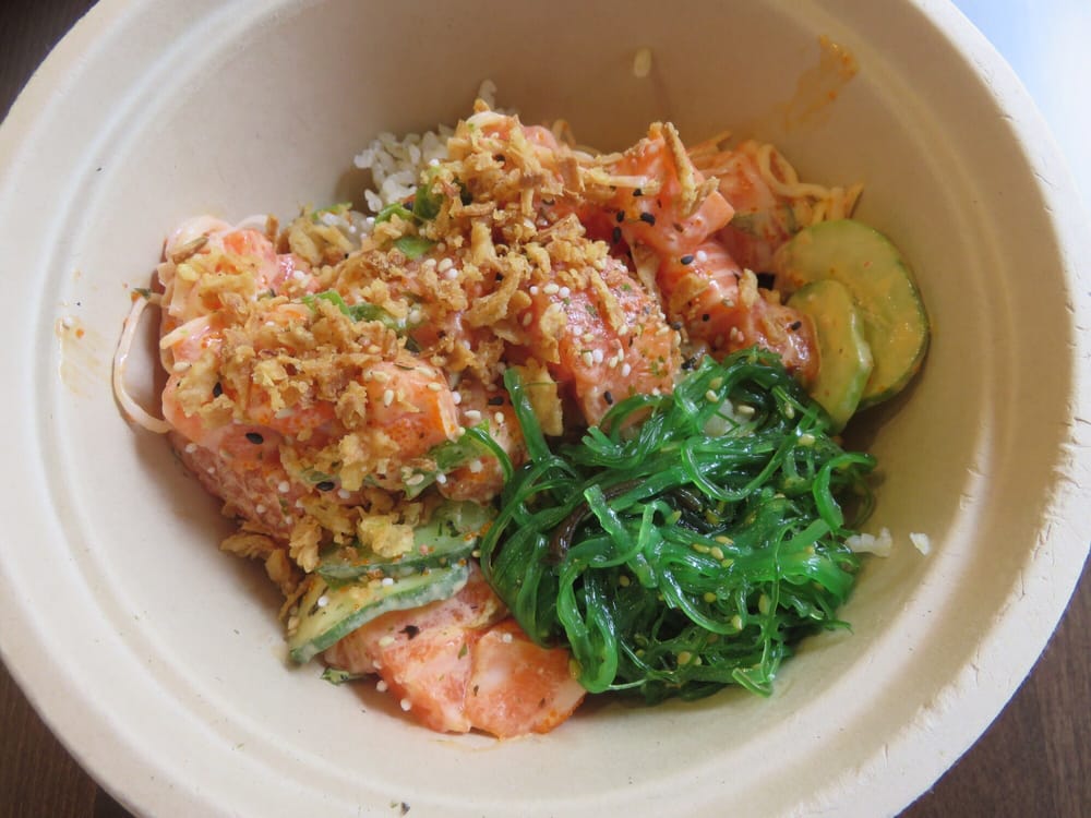 Salmon, shrimp, cucumber, seaweed salad, green onion, mango, sweet furikake, and lime ponzu.