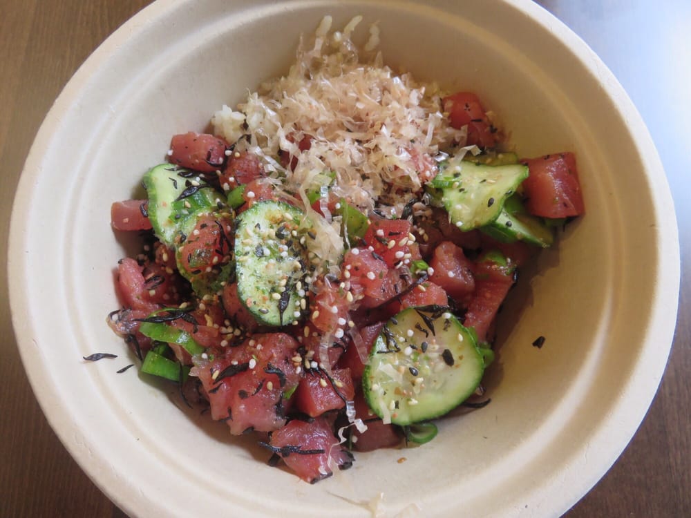 Tuna, cucumber, green onion, hijiki seaweed, sweet furikake, fish flakes, and sesame shoyu.